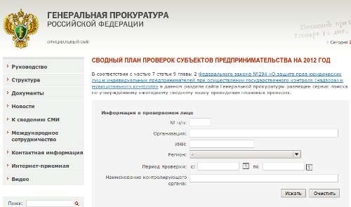 В поисковую систему можно ввести ИНН хозяйствующего субъекта и установить, включен ли индивидуальный предприниматель либо юридическое лицо в план проверок контрольных (надзорных) органов на 2012 год. С помощью поисковой системы также можно выяснить период проверки, а также орган контроля (надзора), полномочный на проведение проверки.