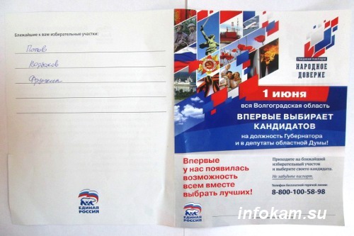 Кстати, по почтовым ящикам камышан тоже разбросали некое «напоминание» по поводу праймериз, выполненное печатным способом. В нем приведен перечень всех претендентов. Фамилии «нужных» выделены крупно и жирно, «нежелательные» значатся микроскопическими буквами.